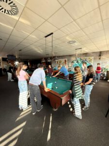 Der Montag begann mit einem besonderen Auftakt: einem gemeinsamen Gottesdienst in der Inselkirche und einer offiziellen Begrüßung auf verschiedenen Sprachen aller internationalen Gäste, sodass sogar nicht-religiöse Schüler durch die Euphorie begeistert waren. Danach tauchten unsere Gäste direkt in den deutschen Schulalltag ein, wie ist er eigentlich so, dieser Unterricht in Deutschland? Doch damit nicht genug – am Nachmittag wartete bereits das erste Highlight: gemeinsames Bowling im Babelsberger Bowlingcenter. Hier wurde gelacht, angefeuert und natürlich auch ehrgeizig um jeden Punkt gekämpft, während andere bei Billard die beste Strategie zum Stoßen entwickelten – aber Vorsicht, auf den Tisch legt man sich nicht!