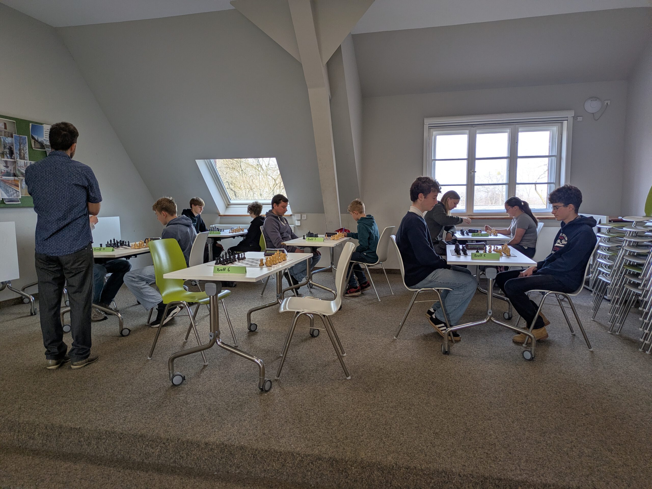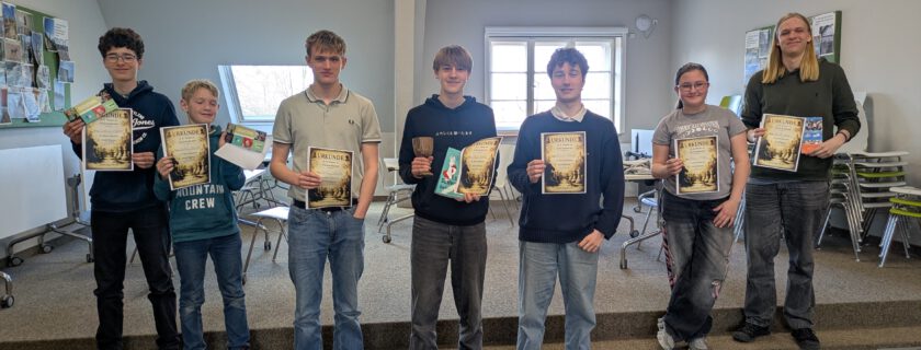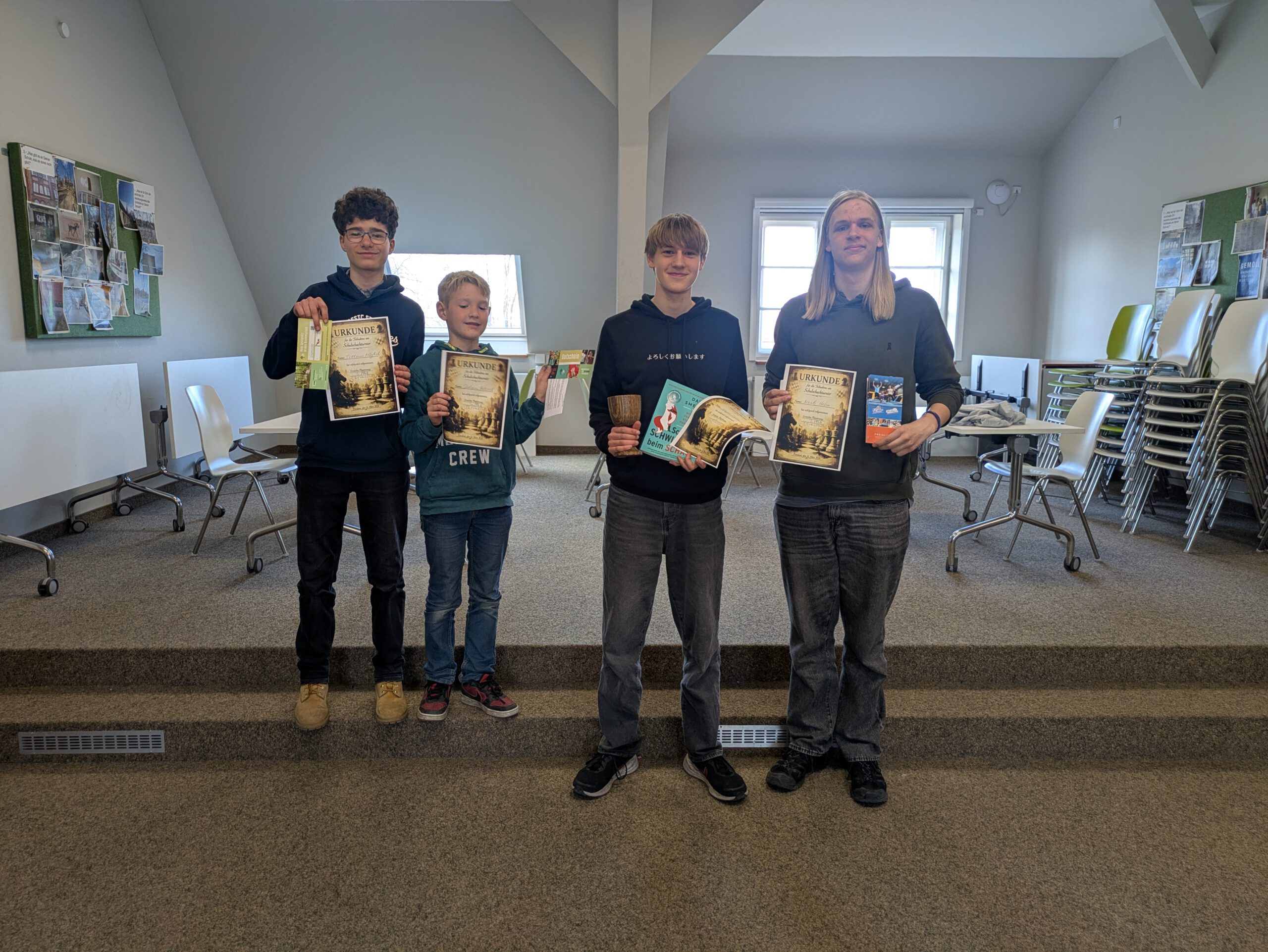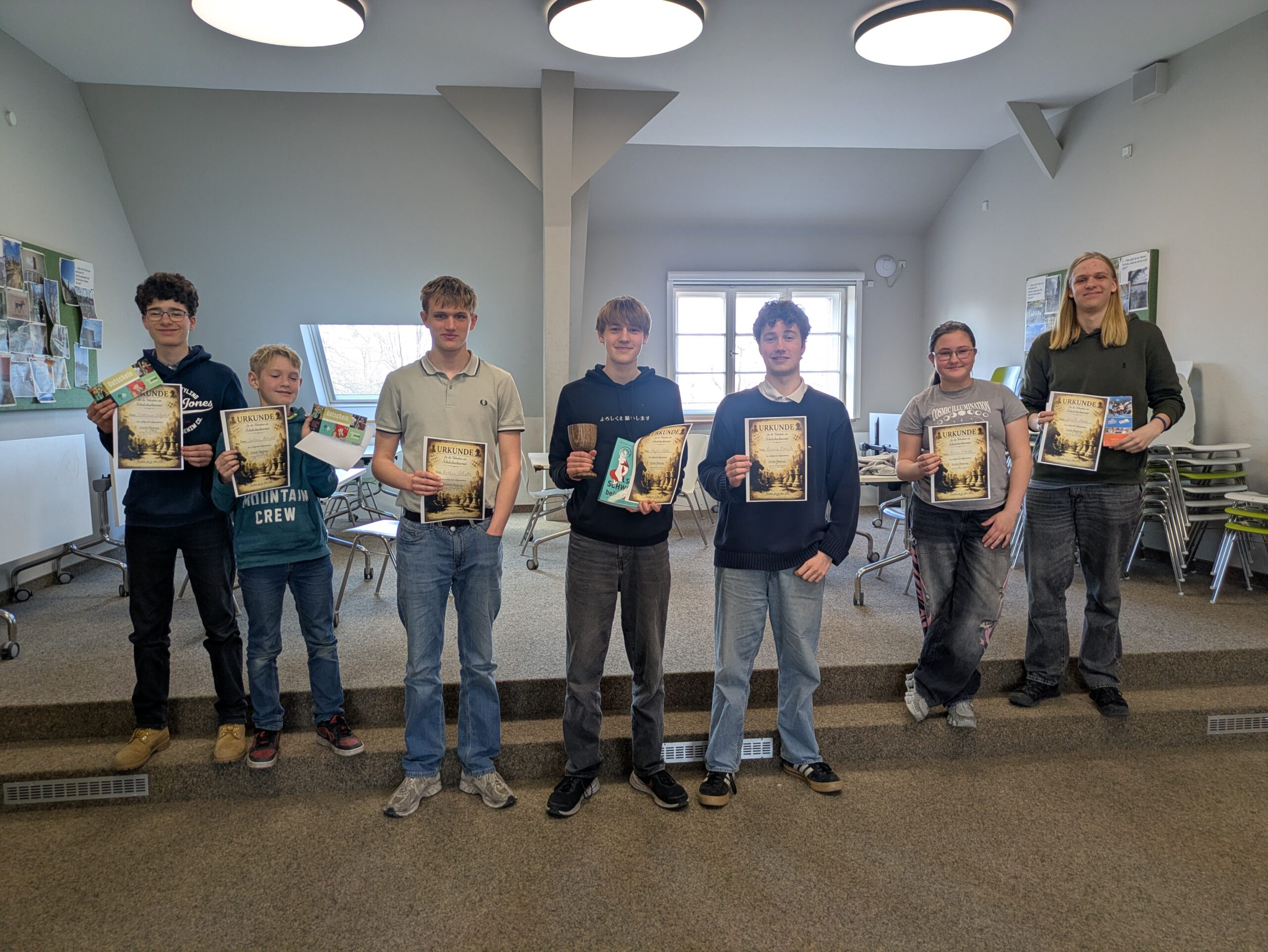 Durch ein Remis teilten sich Johann (5l) und Tillman (9b) den 4. Platz (beide 3,5 von 6 Punkten). Beide bekamen jeweils eine Eintrittskarte, gesponsert vom Kletterpark Potsdam. Arthur aus der 12. sicherte sich den 6. Platz (3 von 6 Punkten), der mit einer wunderbaren Urkunde bedacht wurde, so wie alle Teilnehmenden eine Urkunde erhalten haben. Auf Platz 7 lag Karl (7c) mit 2 von 5 Punkten. Den 8. Platz teilten sich Alina (6. Klasse) und Bruno (8a), beide mit 1,5 von 5 Punkten. Das Teilnehmerfeld vervollständigte Paul aus der 5l mit dem 10. Platz.
