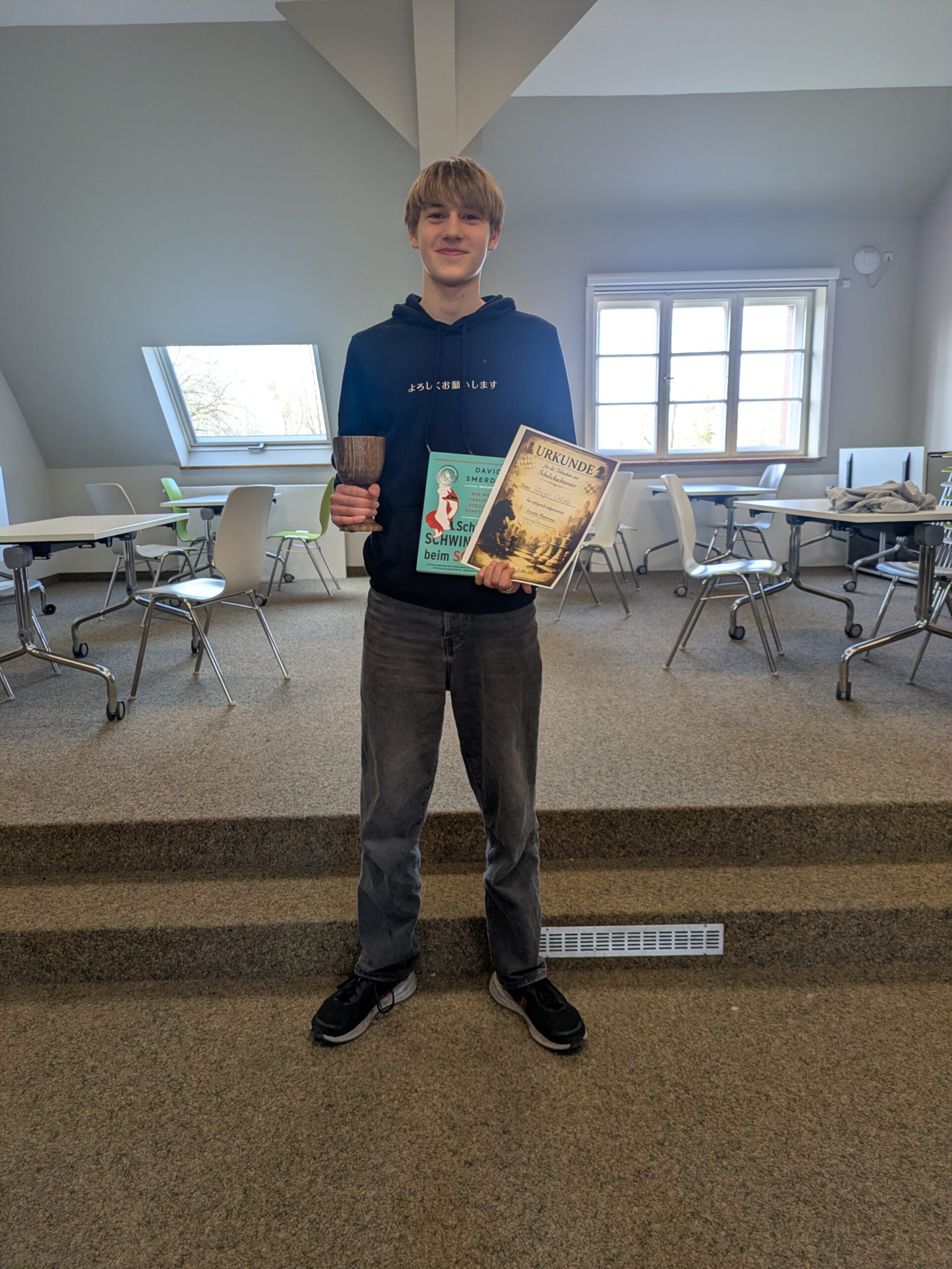 Als Ausblick wäre eine Schach-AG am Gymnasium in Hermannswerder wünschenswert. Vielleicht kann das Gymnasium Hermannswerder sogar bei der nächsten Schulschachmeisterschaft 2027 des Landes Brandenburg eine eigene Mannschaft stellen. Auf jeden Fall wird es spätestens Anfang 2027 das nächste Schachturnier am Gymnasium Hermannswerder geben, bei dem Hugo seinen Pokal verteidigen wird. Ich hoffe, dass auch alle anderen TeilnehmerInnen wieder dabei sind und noch viele neue dazukommen.