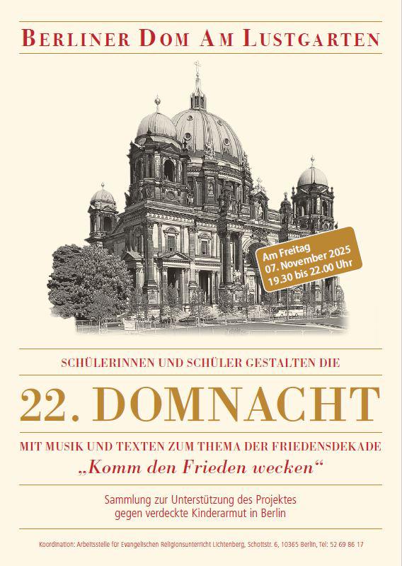 Freitag, den 07.11.2025 (19.30 Uhr, Berliner Dom/Am Lustgarten) Der Eintritt ist frei. Eine Kollekte für den Fonds „Verdeckte Kinderarmut“ wird gesammelt. Die Domnacht, welche in diesem Jahr bereits zum 22. Mal stattfindet, wird von der Arbeitsstelle für Religionsunterricht in Berlin/Lichtenberg veranstaltet. Schulchöre von acht Gymnasien aus Berlin, Bernau und Potsdam führen im Dom geistliche und weltliche Musik auf. Zwischen den Chorstücken werden Texte zum Thema der Friedensdekade gelesen: „Komm den Frieden wecken“.